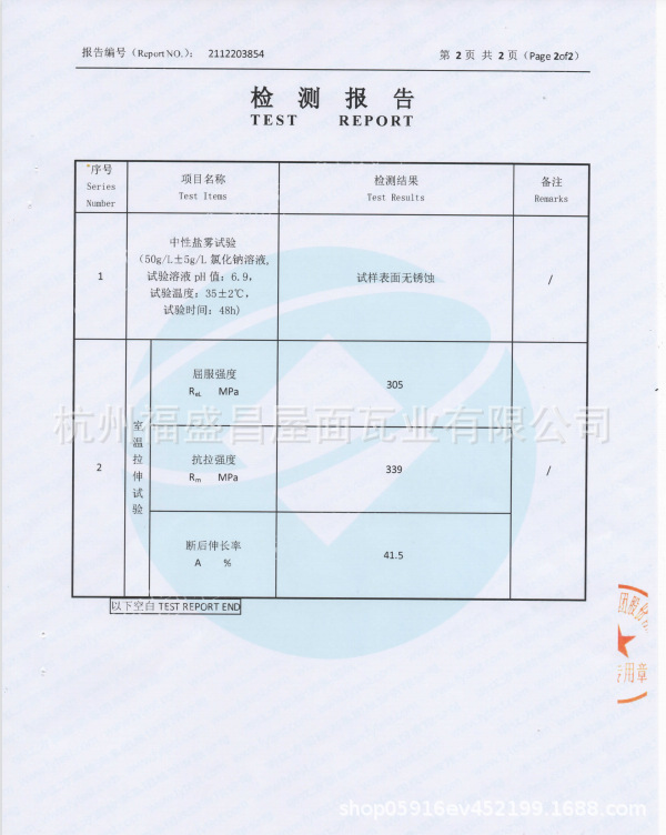福盛昌镀铝锌挂瓦条测试报告:GB/T10125-2012《人造气氛腐蚀试验 盐雾试验》、GB/T228.1-2010《金属材料 拉伸试验 第1部分:室温试验方法》